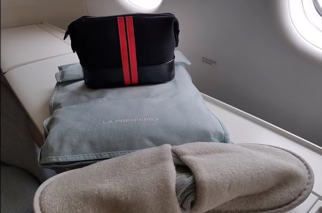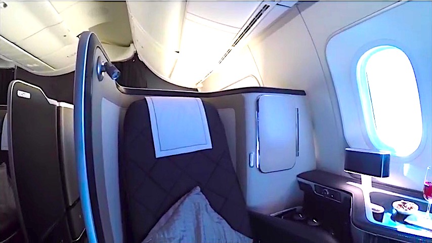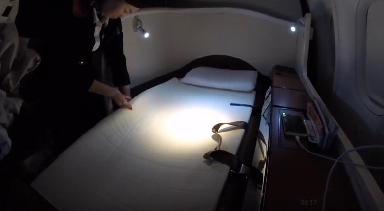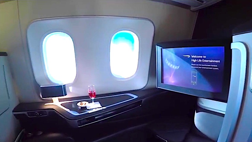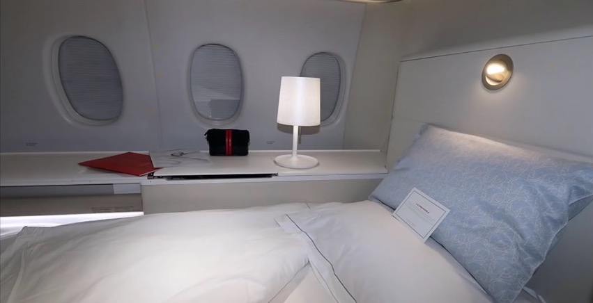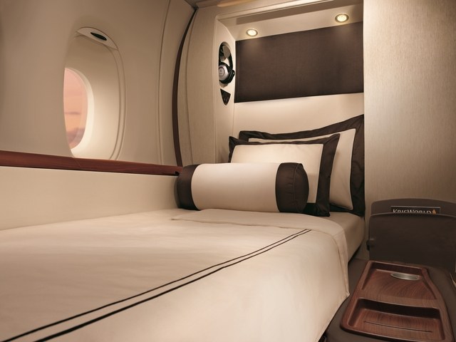 Not to be outdone, Air France’s La Premier cabins are referred to as suites, and tout all the fantastic dressings you would expect from France. Privacy is utmost here. In that respect, your seat becomes more of a bedroom, with curtains to close away from everything. The leather and suede massage seats recline into a 6.5-inch Sofitel My Bed with lamp, and ottoman too. Meals are prepared by French Michelin Star chefs and breakfast can be served in bed. All this sums up a flight experience that has been massively raved about.