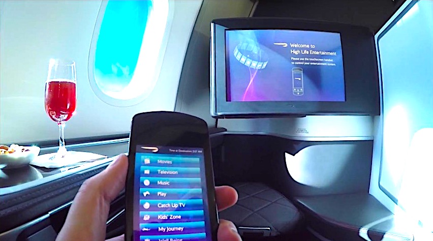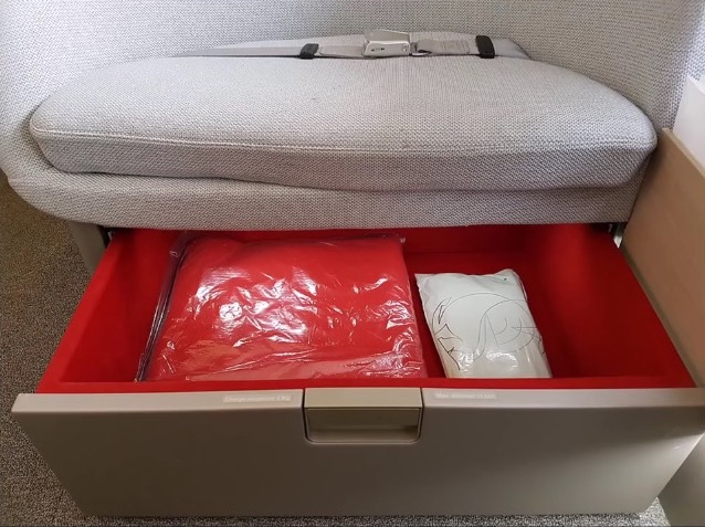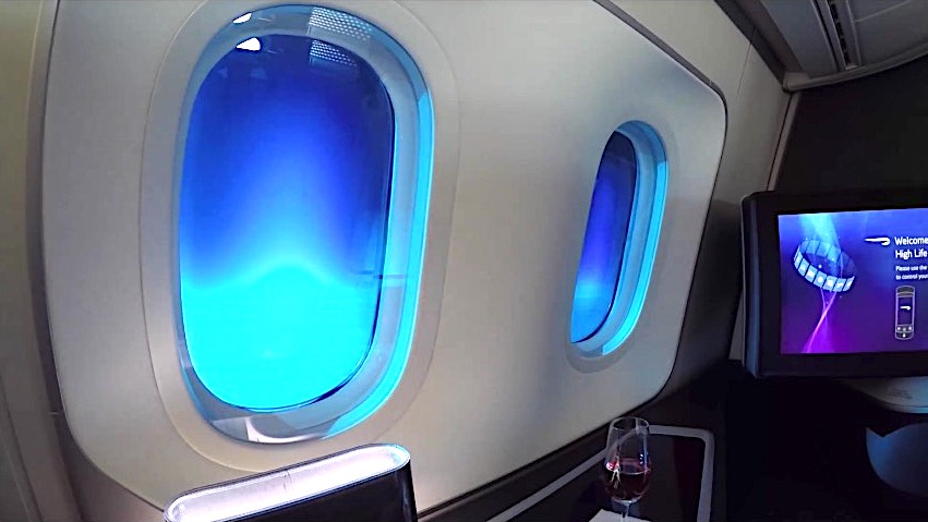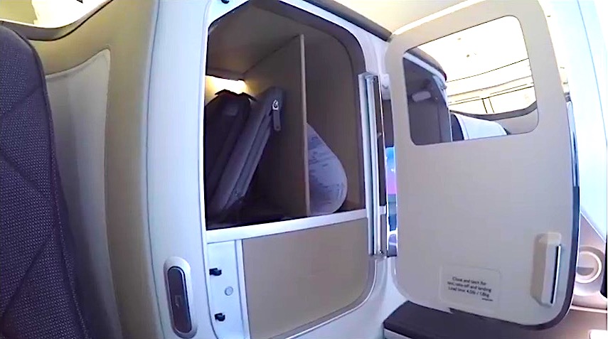 Up first for us are the first class cabins on the British Airways’ 787 Dreamliner. At more than $5000 per seat, you get a fixed 23-inch display screen, and an in-seat touchscreen remote to control it. There are two storage areas, one with a mirror tucked inside, window dimmers, pajamas, filled toiletries bag, anytime dining with full table, and full bed with mattress topper. Not at all a bad way to fly.