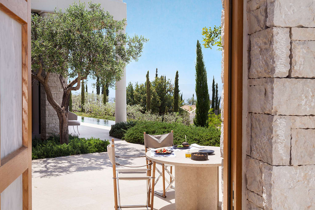 The Amanzoe Resort is situated on a hilltop, close to the Greek town of Porti Heli. Its location offers stunning panoramic views of the breathtaking Peloponnese coastline and the island of Spetses, one of the most sought after and beautiful areas of Greece. The lovely resort has 38 gorgeous and contemporary guest pavilions, each with their own private pool, private stone courtyard, high ceilings, private terrace and the best amenities you can imagine!