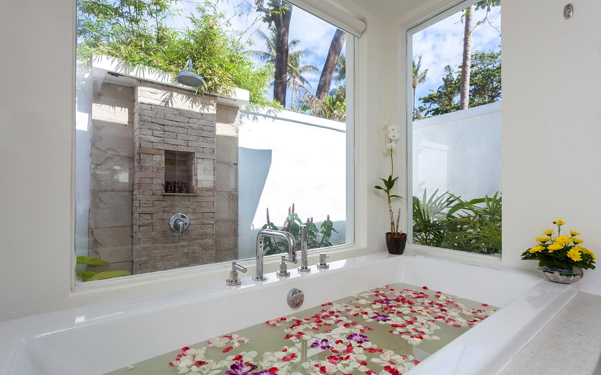 The Racha Resort is located on its own stunning, serene island, very close to Phuket, Thailand. The villas here are whitewashed, very chic and in direct contrast to the breathtaking turquoise ocean that is just steps away. The Racha is an eco-friendly resort and it’s clean lines and uncluttered decor make it the perfect retreat from a sun drenched day on the water and beach. Some suites have their own plunge pools, ALL have spacious, luxurious decor and linens and all have bathrooms you will probably want to spend the day in..outdoor rain showers and huge spa tubs!