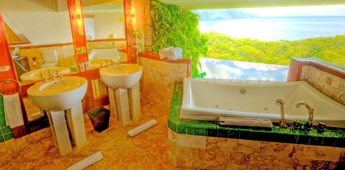 Jade Mountain Resort’s accommodations include 24 rooms that are referred to as Sun, Moon, Star, Sky and Galaxy sanctuaries that range from 1400 to 1000 square feet. Each has its own infinity pool, is a unique work of art, and creates panoramic views of the mountains and ocean of Saint Lucia. Fifteen foot ceilings cap off the room, but the 4th wall of your room has an open design to overlook the landscape, as well as allow privacy, aside from that, layout and room size depend on which you choose. The Sky Sanctuaries being above the ground can’t have a pool so you enjoy Jacuzzis in those suites.