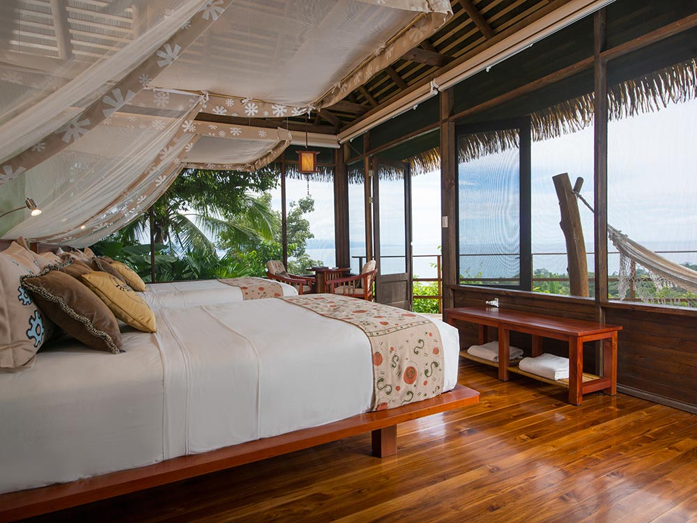The Lapa Rios sits on 1000 acres of rainforest preserve and offers an awesome pool, 16 luxurious bungalows that are open air, have private decks, rain head showers, awesome hammocks, king and queen beds with organic cotton linens, huge, wonderful bathrooms with two showers, locally made soaps and shampoos, complimentary local coffee, twice a day maid service and evening turn down service with a nice twist! You will be “off the grid” here, so to speak, as there are no TVs, no internet, no phones, no radios, no A.C. or hair dryers. At this resort, you will only find harmony and tranquility, something most of us desperately need!