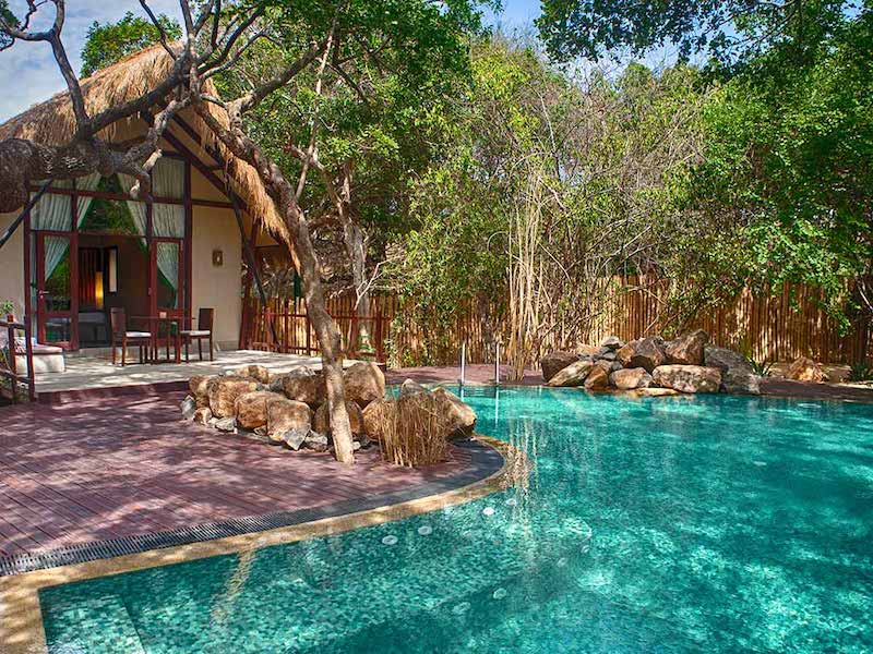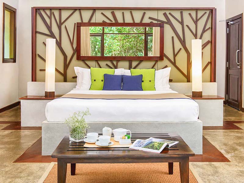Beach cabins here are the Jungle Beach Resort have vaulted ceilings, thatched roof, and private terraces, while the Jungle Cluster Cabin shares the same comfort but is perfect for small groups who want a private piece of the resort to enjoy together. Be sure that all of the villas are also eco-friendly, and the hospitality is especially friendly.