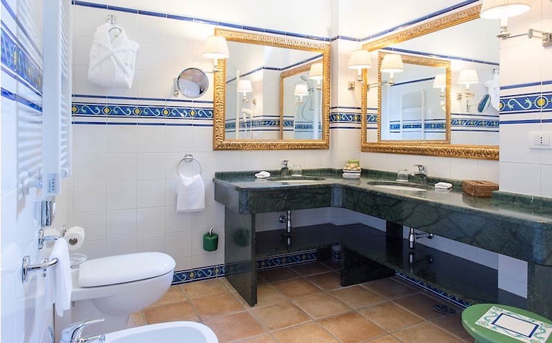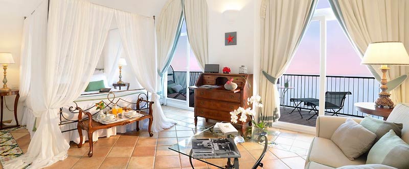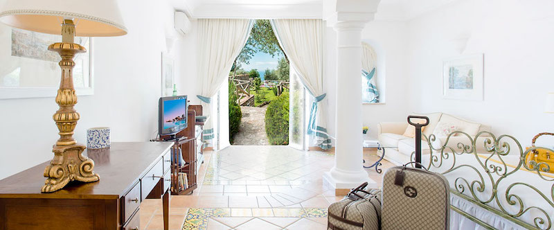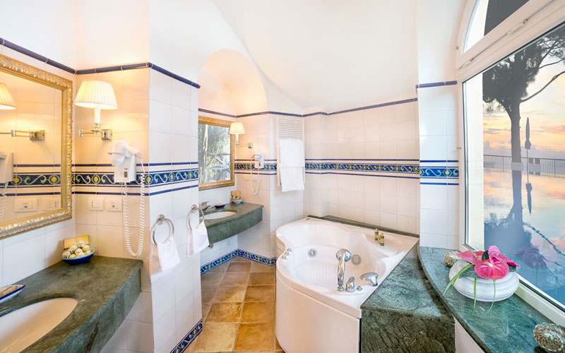 Accommodations at the Caesar Augustus are large, open and packed with luxurious amenities such as natural olive oil bath products, Wi-Fi, marble bathrooms, jacuzzi bathtubs and the finest linens to insure your rest and comfort. There are 8 styles of suites and rooms here with the most luxurious being the Capri Master Suite. It features original antique furniture, a super king bed, marble bathtub, and rainshower. This top floor suite also has 360 degree views of the sea.