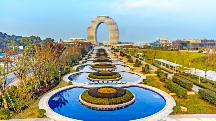 For architecture buffs, the Huzhou Hot Spring Resort in China draws many people to not only its unique architecture, but the awesome stay you will enjoy there. The resort is 27-stories tall with two towers that meet at the top to create a ringed hotel that defies gravity to an extent. It even has its own private beach, among other facilities that are especially built for your stay.