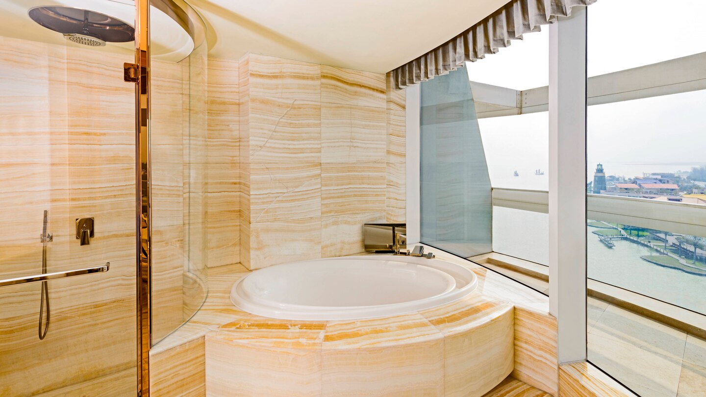 The Crystal and Jade Towers rise over Tai Lake and offer fantastic views of Huzhou. The 100-meter towers offer 281 rooms that are luxurious to suit the needs of the most discerning world traveler with spa, restaurants, a grand ballroom for conferences, and a wedding island for those who come to marry and honeymoon here.
