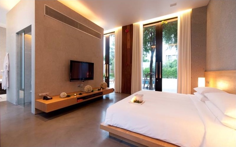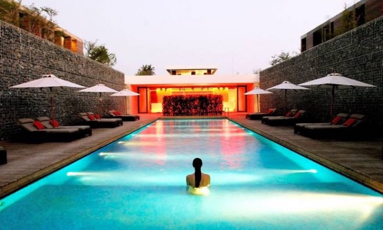 The Hotel De La Paix Cha-Am Beach is the epitome of pure designer minimalism with a giant marble stairway, stunning mesh and stone structures, and mellow music oozing from the walls. It is heaven in Thailand and shares a reflection pool and breathtaking ocean views.