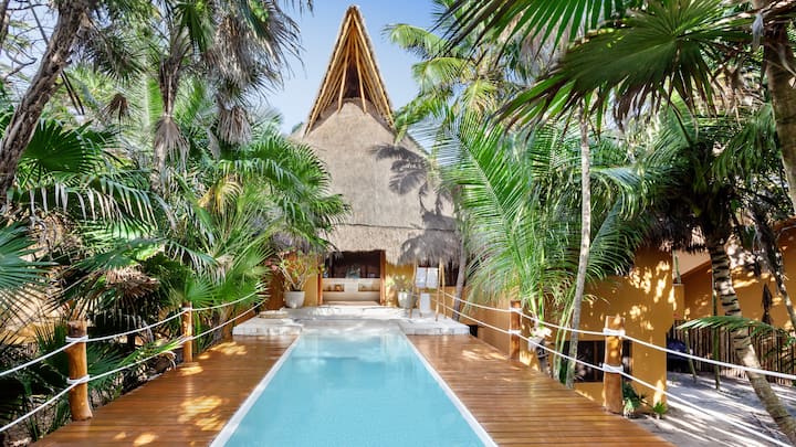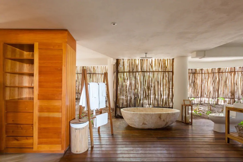 A lucky guest, and up to 9 of their friends can gather together at Casa Nalum in Tulum, Mexico. The 5 bedroom retreat has a traditional architectural style, right on the beach, with all of Tulum to enjoy. As the setting, guests will enjoy Mayan ruins, gorgeous cenotes, caves, and wildlife.