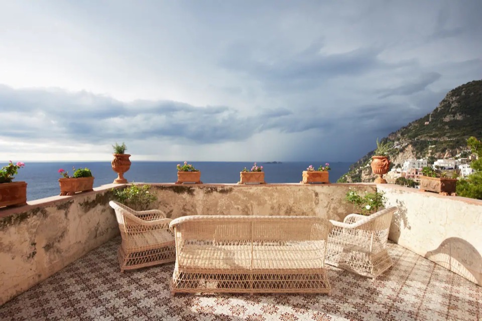In addition to the cliffside views of Positano, there are also potted flowers and a swimming pool along the rugged coastline of the Amalfi Coast from this vintage Mediterranean retreat. Inside, you can walk on the terracotta floors beneath colorful frescoes, dramatic ceilings, and Renaissance paintings.