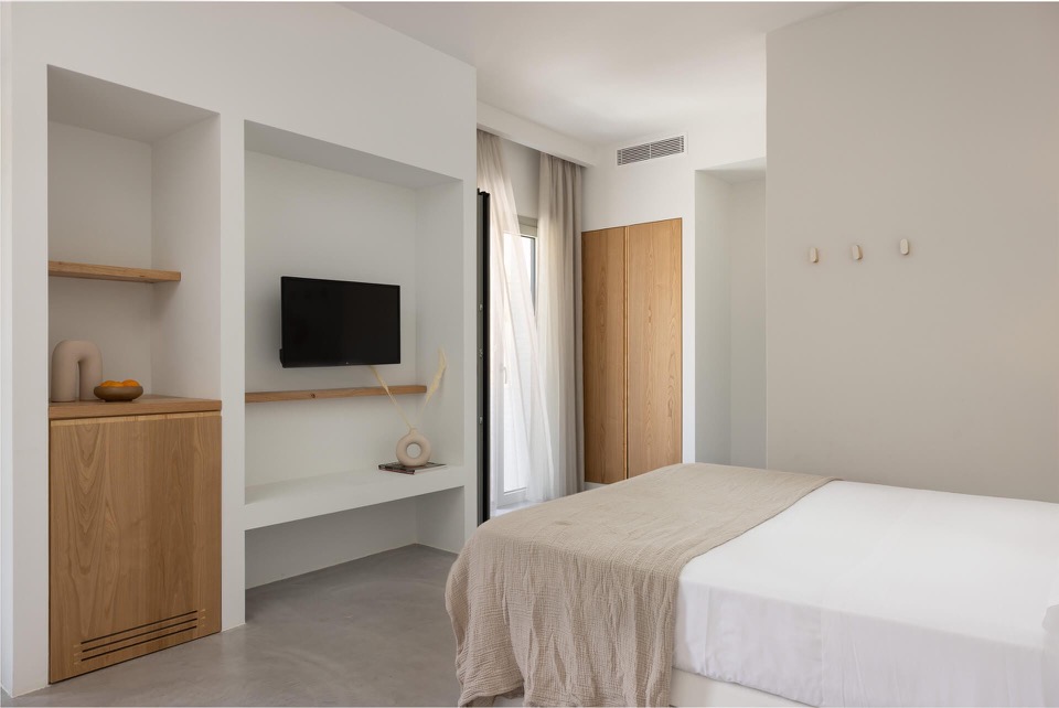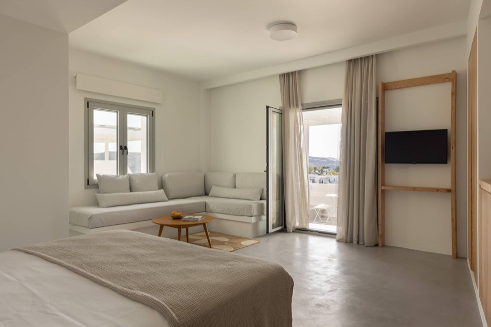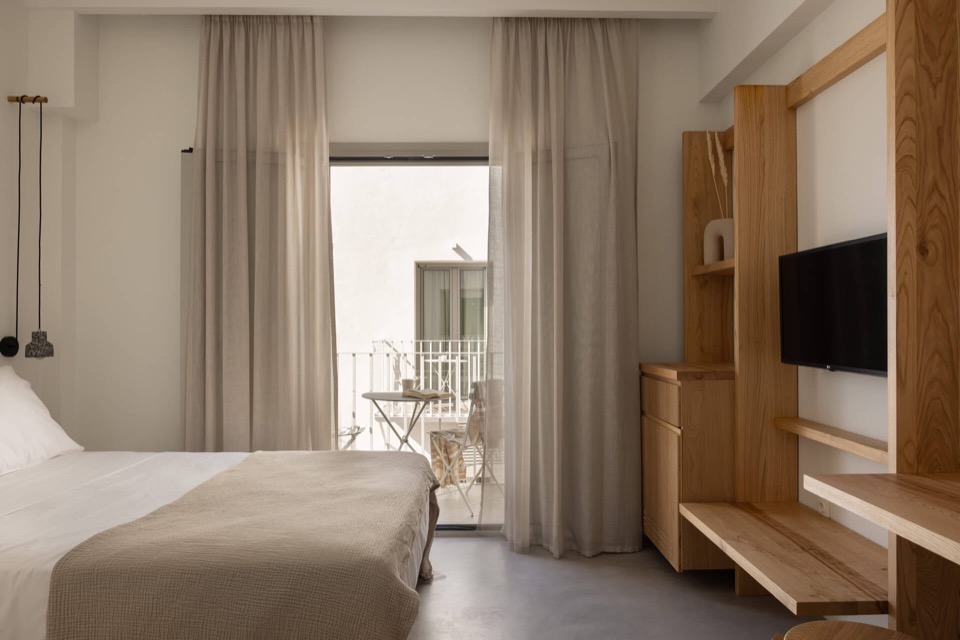 From cozy standard rooms to spacious suites with balconies overlooking the picturesque harbor or winding alleyways, Nostos creates a stay that’s as memorable as the island itself. Wood-beamed ceilings, traditional Cretan textiles, and handcrafted furniture offer a sense of authenticity that larger hotels can’t match.