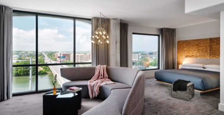 Housed in a mid-century modern building with roots dating back to the 1960s, The LINE Austin embraces history while delivering present-day flair. The aesthetic is bold yet calming—expect a mix of raw concrete, clean lines, and eclectic art curated by local creatives. Floor-to-ceiling windows open to sweeping views of Lady Bird Lake or the vibrant downtown skyline, making the moment you enter your room feel cinematic.